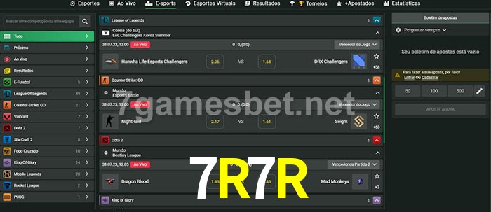 O 7R7R oferece uma grande seleção de opções de apostas em e-sports com probabilidades competitivas